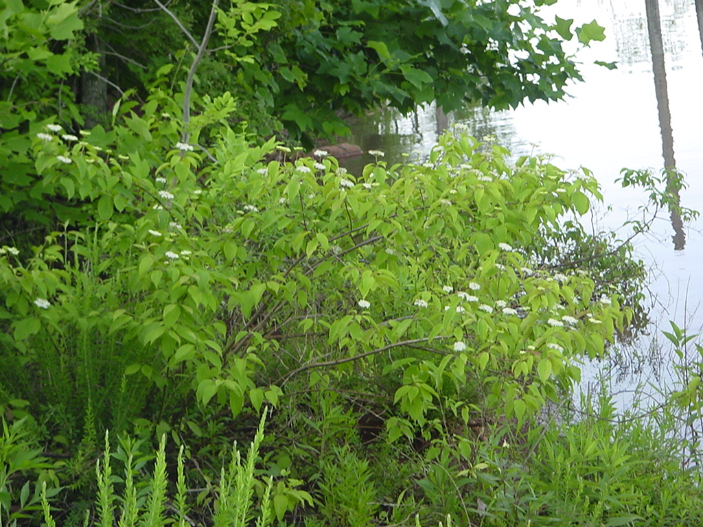 Silky Dogwood is a good shrub for wet shady areas. The leaves are similar to the Virginia State flower tree seen in the woods and landscape planting. It's small white blooms emerge in clusters from April to May and bloom into June forming drupes of berries that turn blue in August. Birds are attracted to the fruit and deer do not chew the leaves. It can grow from 6 to 12 feet high and wide in a rounded form sometimes making thickets from stems that touch the ground and root. The leaves and twigs have silky hairs along the undersides. It is often used for erosion controll along the banks of streams and lakes.